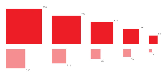 比例面积图通常使用正方形或圆形,常见技术错误是,使用长度来确定形状大小,而非计算形状中的空间面积,导致数值出现指数级的增长和减少。