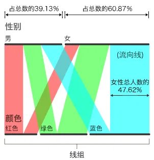 每个线集对应于一个维度/数据集,其数值/类别由该线集内的不同线段所表示。每条线的宽度和流程路径,均由类别总数的比例份数所决定。每条流程路径都可以用不同颜色代表,以显示和比较不同类别之间的分布。