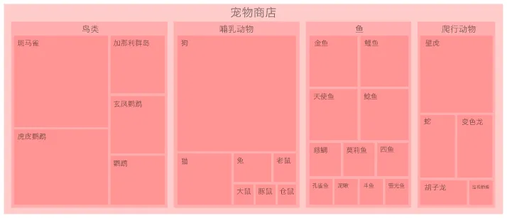 树状结构图 (Treemap) 是一种利用嵌套式矩形显示层次结构的方法,同时通过面积大小显示每个类别的数量。