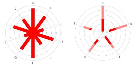 每个变量都具有自己的轴(从中心开始)。所有的轴都以径向排列,彼此之间的距离相等,所有轴都有相同的刻度。轴与轴之间的网格线通常只作指引用途。每个变量数值会画在其所属轴线之上,数据集内的所有变量将连在一起形成一个多边形。