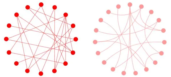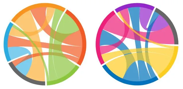 节点围绕着圆周分布,点与点之间以弧线或贝塞尔曲线彼此连接以显示当中关系,然后通过每个圆弧的大小比例再给每个连接分配数值。此外,也可以用颜色将数据分成不同类别,有助于进行比较和区分。