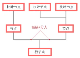 其结构通常由没有上级/父级成员的元素开始(根节点),然后加入节点,再用线连在一起,称为分支,表示成员之间的关系和连接。最后是枝叶节点(或称为末端节点),是没有子节点的成员。