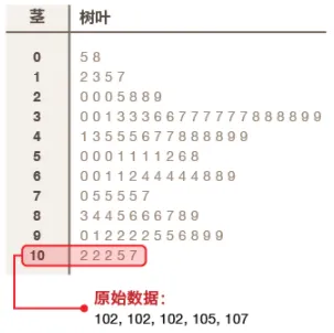 不变的位数由小至大、由上至下显示在中间的「茎」(通常是以十为单位),每个位数之内的数据则会成为「叶」并横向延伸。