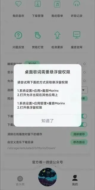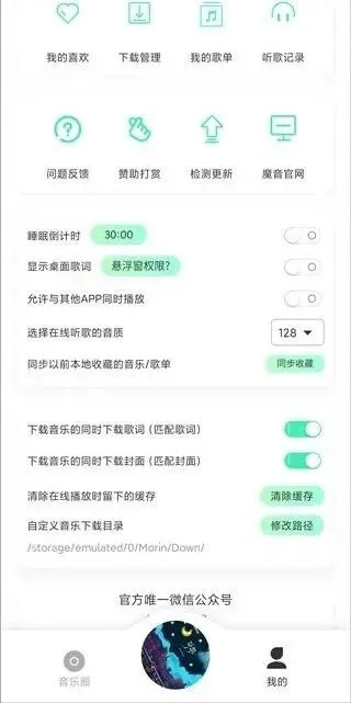 1、下载魔音morin打开之后,然后点击我的,有一个可以显示歌词的选项