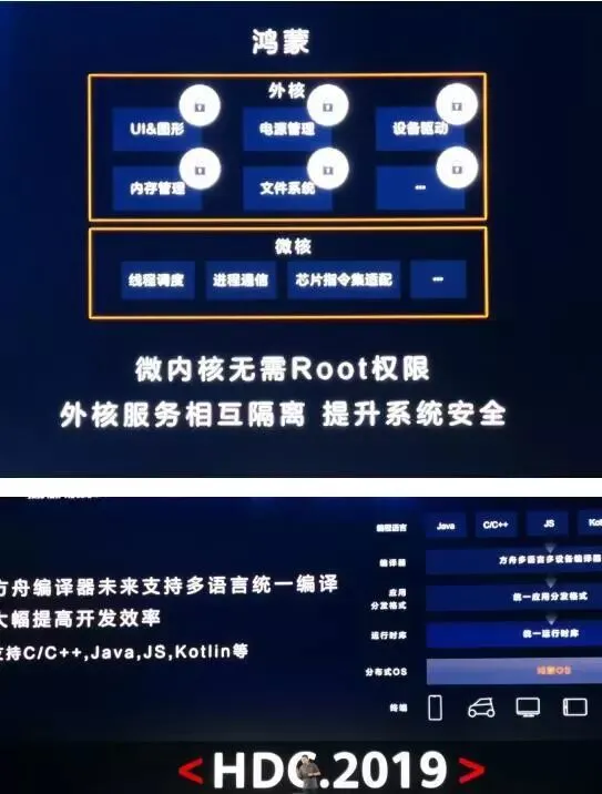 还有通过微内核架构重新构建的设备可信安全系统,以及通过多终端开发IDE,多语言统一编译,实现的一次开发、多端跨平台部署的生态共享能力。