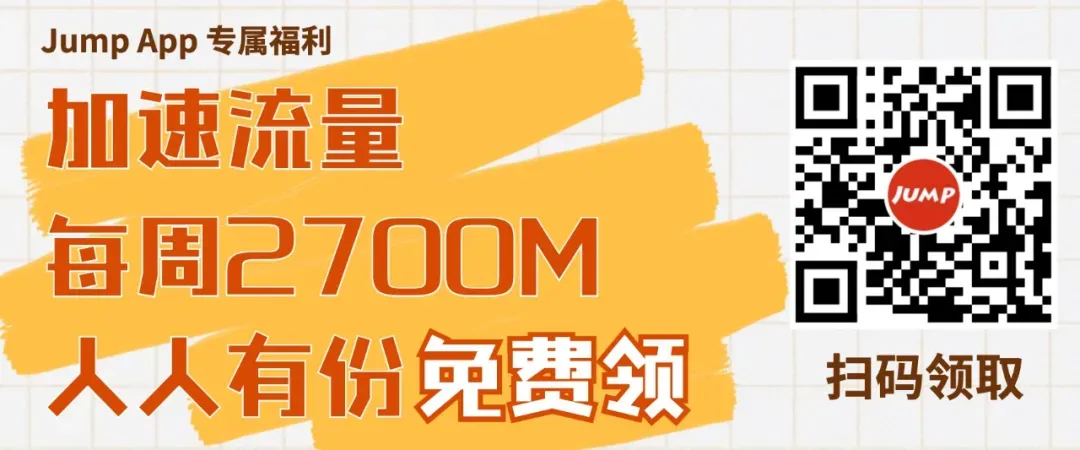 Jump App「免费领加速流量」功能豪华升级,每日流量获取上限提升超过100%!!!每周共有2700M流量免费赠送,完全免费,人人有份哦~