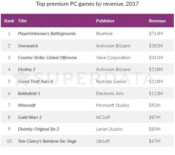 《绝地求生》、《守望先锋》、《反恐精英:全球攻势》、《命运2》、《GTA5》、《战地1》、《我的世界》、《激战2》、《神界:原罪2》、《彩虹六号:围攻》