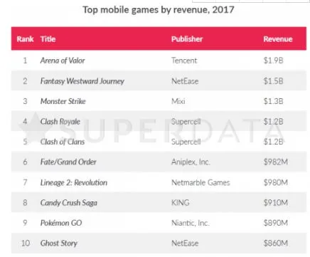 《王者荣耀》、《梦幻西游》、《怪物弹珠》、《皇室战争》、《天堂M》、《糖果粉碎传奇》、《部落冲突》、《Fate/Grand Order》、《Pokemon GO》、《大战神》