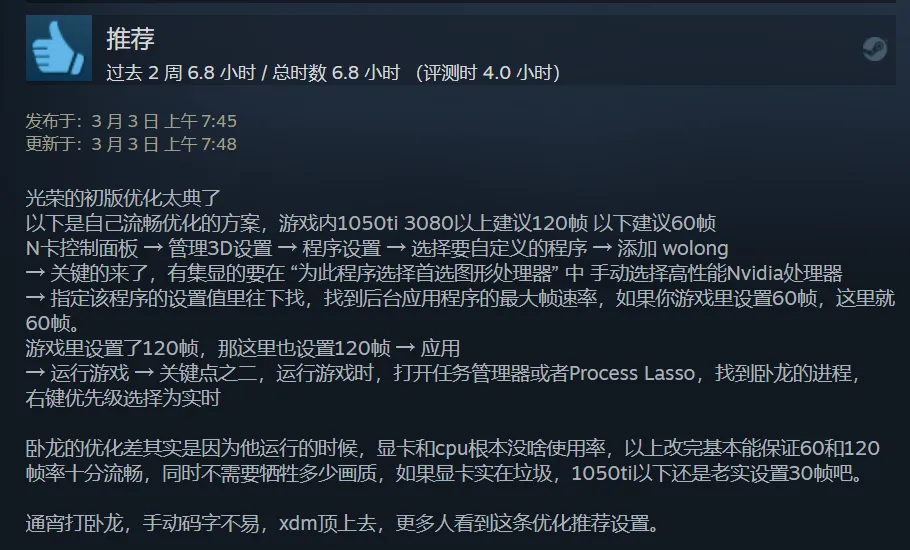 撇开“键鼠适配烂”这些光荣游戏的老毛病,咱们这里就单拿优化说事。PC版《卧龙》的推荐显卡配置是RTX 2060,最低配置仅需GTX 1650,看起来还算亲民对吧。可真进入游戏,不少玩家反馈即使3060都只能玩最低画质,甚至顶配4090都会掉帧。网上传言纷纷,有人说是照着网上的教程更改设置后,低配显卡也能正常玩,似乎游戏卡顿的主要原因是它默认使用核显;