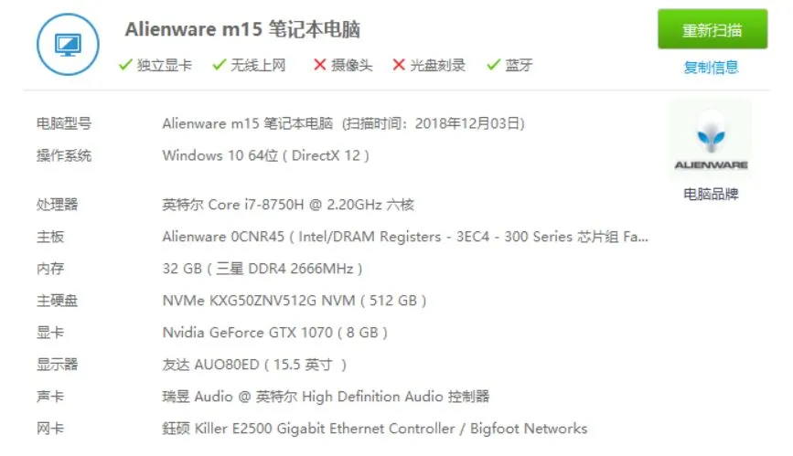 外星人m15配备了Intel第八代CPU i7-8750H,英伟达GTX 1070 Max-Q显卡,两根三星的DDR4 16G内存,总共32G,以及两块512G固态硬盘。