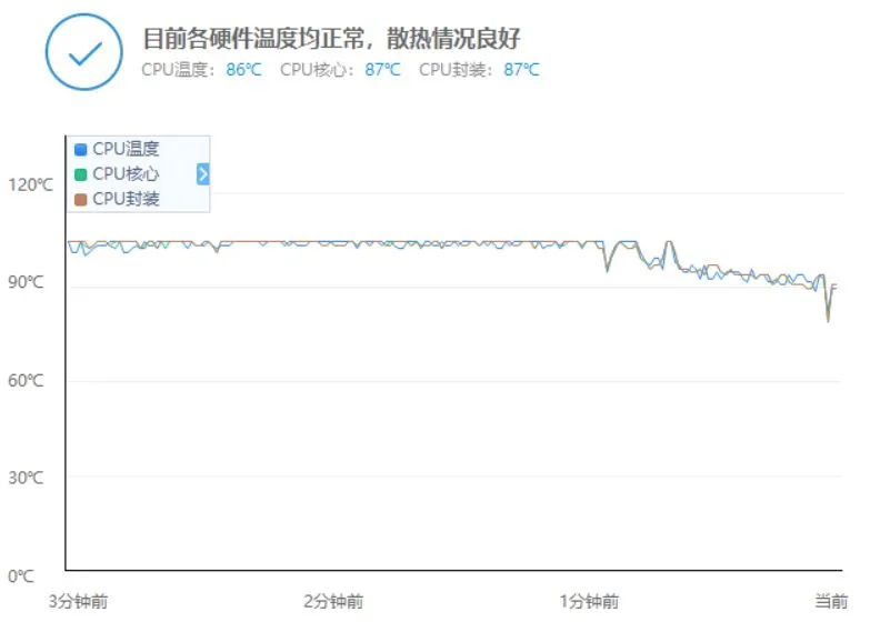 从鲁大师的温度显示上,我们可以看到,在游戏运行期间,温度基本一直维持在90℃以上。