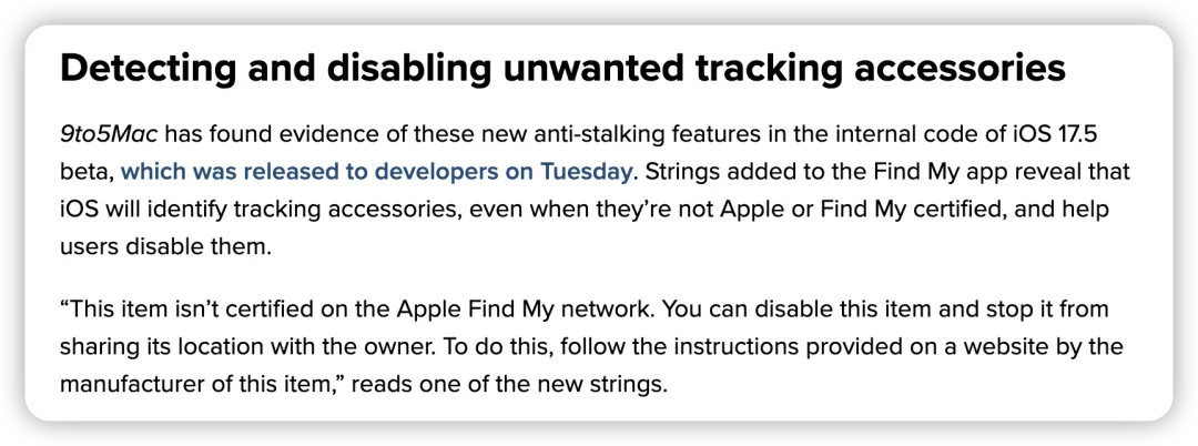 具体来说,不法分子可利用 AirTag 等配件对受害者进行跟踪,为用户造成了诸多困扰。现在,9to5Mac 在 iOS 17.5 Beta 版的内部代码中,发现了即将上线的反跟踪功能。
