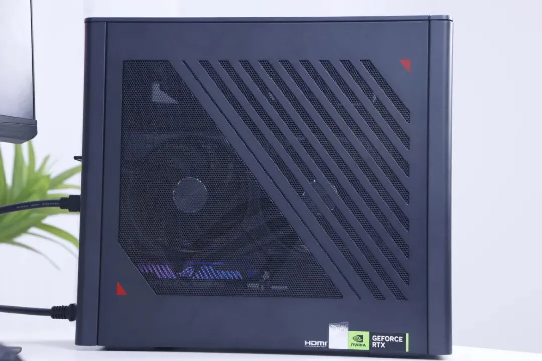 小巧的身型使得大多数mini PC难以兼顾内部散热与硬件性能,而为了让ROG冰刃X游戏PC更加“冷静”,在散热结构的设计部分,它也多有考究——ROG冰刃X游戏PC在右侧预装了金属进气网格,左侧预装了金属进气网格搭配半透板,顶部设计了散热孔,从而能够在增添设计感的同时,通过交织的冰川散热结构弥足散热,避免内部的热量堆积。而且,其内部CPU处还采用定制水冷,包含180冷排和2个9cm风扇,可以极大地改善散热效果。