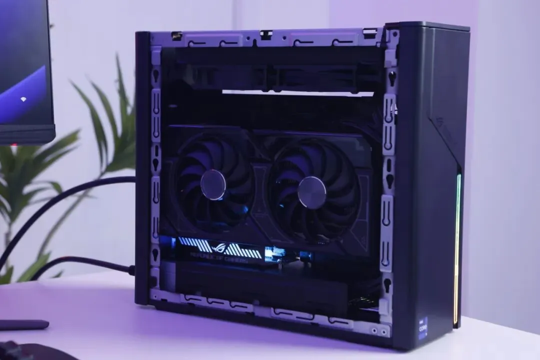 🔺ROG冰刃X游戏PC的左侧设计了金属进气网格搭配半透板,内部显卡下方还具备RGB背光效果。