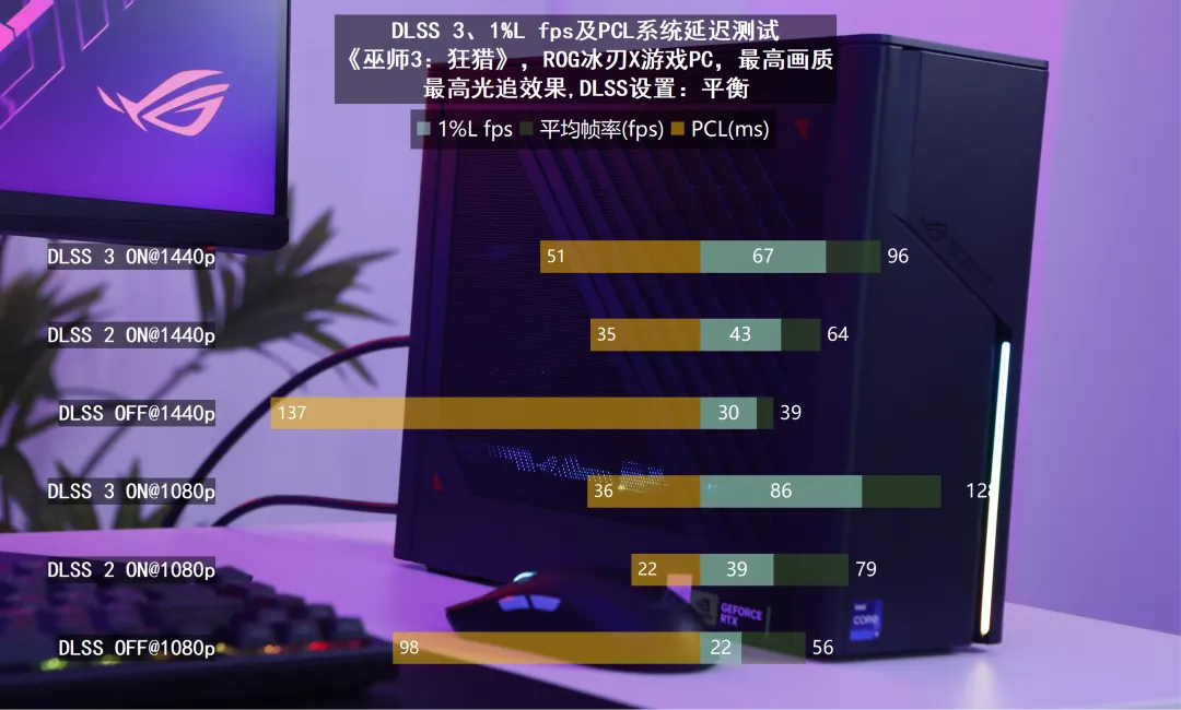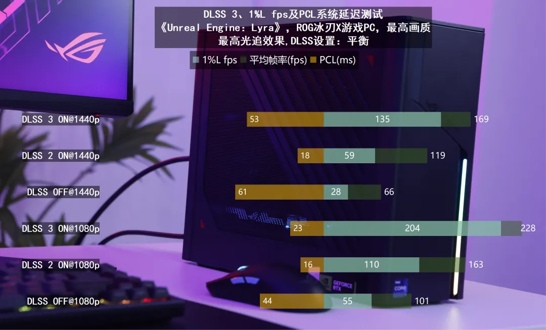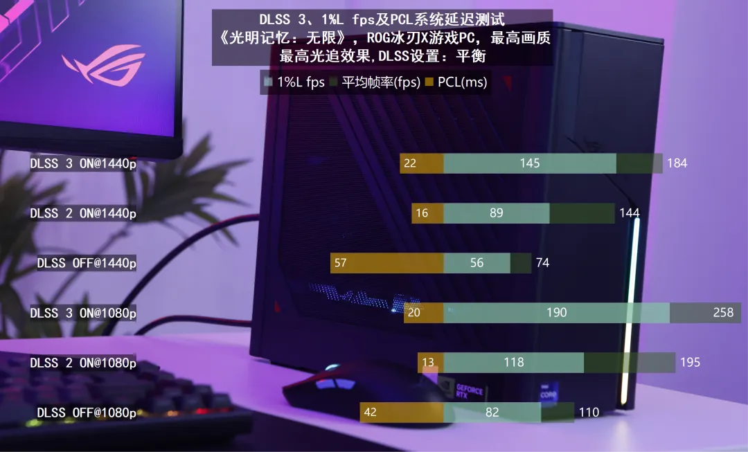 另外,由于RTX 40系GPU标配全新的DLSS 3技术,且该技术增加了Frame Generation帧生成功能,能够在DLSS 2的基础上将游戏帧率翻倍的同时,不影响整体画质。由此,我们还通过ROG冰刃X游戏PC对以上支持DLSS 3的游戏进行了相关测试。从结果来看,ASUS Dual GeForce RTX 4070 12GB显卡相较于原生帧率有着“泾渭分明”般的差距,同样以《赛博朋克2077》为例,在1080p、1440p分辨率中,开启DLSS 3之后的游戏帧率分别为178fps与119fps,帧率提升幅度分别为187%与205%。值得一提的是,RTX 40系GPU在开启DLSS 3时还会自动启动NVIDIA Reflex低延迟技术,能够起到抑制系统延迟的作用,根据FrameView抓取的数据,我们也能清楚地看到,相较于原生帧率,开启DLSS 3之后的游戏系统延迟确实有了非常明显的抑制。这也意味着,购置ROG冰刃X游戏PC的玩家完全可以通过该技术搭配高刷率显示器使用。