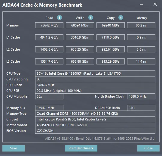 从结果来看,在内存性能方面ROG冰刃X游戏PC搭载的32GB DDR5 4800双通道内存读取性能为75642MB/s、写入性能为68594MB/s、延迟为86.2ns,符合DDR5内存的主流水准。