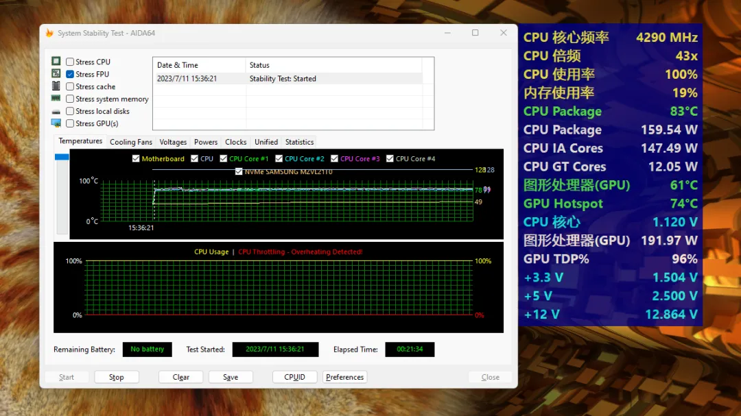 在稳定性测试环节,我们通过Aida 64的FPU稳定性Benchmark以及Furmark对ROG冰刃X游戏PC进行双烤测试。