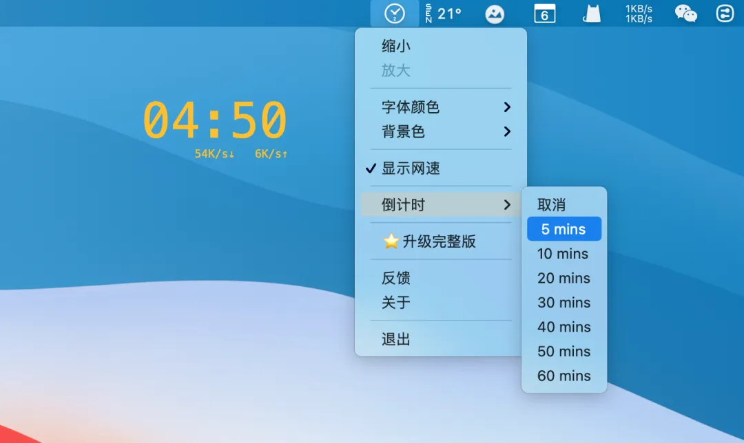 另外软件也可以临时显示倒计时。从5分钟到1小时一共 7 个默认时常选择。