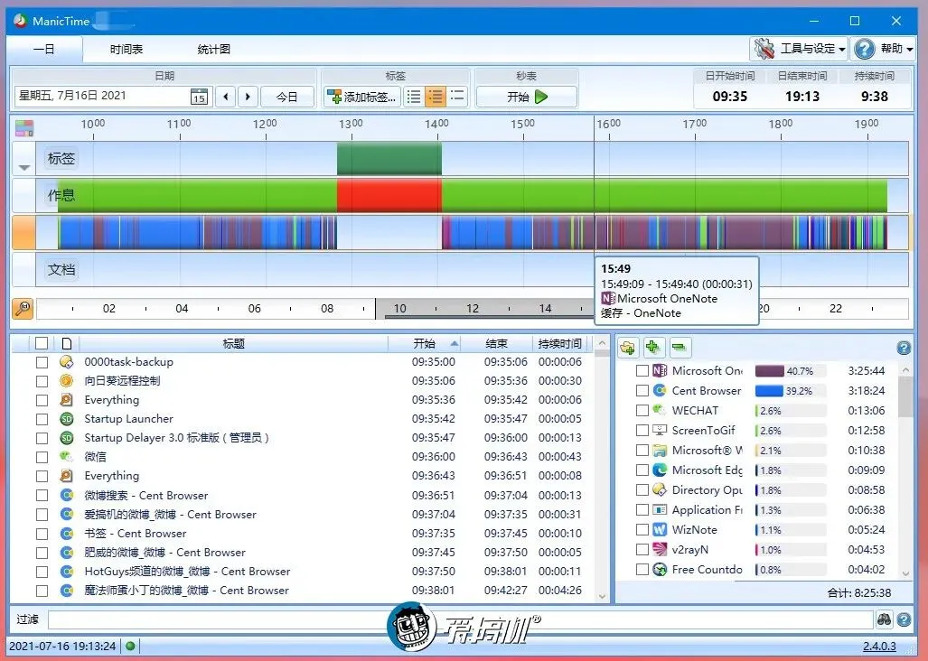 ManicTime:疯狂的时间记录,自动读取任务栏激活的程序名。什么时候打开什么软件,开了多久,全都记录在案,有自动标签和统计。自从用上它,再也没写过日记了。如女朋友/老婆有查岗习惯,记得打开自带的密码保护和隐藏托盘图标功能;