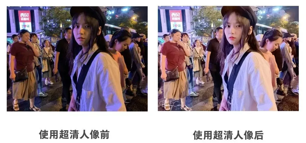 能够美颜定制什么,我就不说了,比较让我心水的是它的「超清人像」暗光环境下表现力极强,拍完照片,点击「下一步」就能还原肤色!