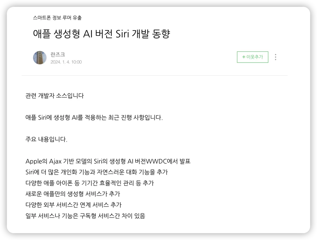同时,新版 Siri 将支持用户为其添加预设命令,类似目前的快捷指令 App,并开放服务接口,允许与第三方应用程序进行互动。最后,@yeux1122 还着重提及了关于新版 Siri 可能上线的订阅服务。预计在 iOS 18 中,Siri 将提供免费和订阅制两种服务方式。