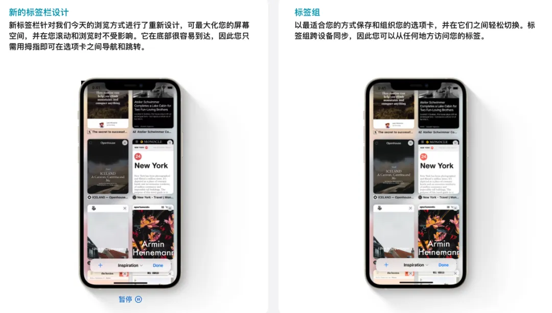 重新设计的 Safari 浏览器优化了屏幕空间,并且突出正在观看的内容,新标签页栏也更紧凑,悬浮在屏幕底部,标签页之间的切换更加方便。