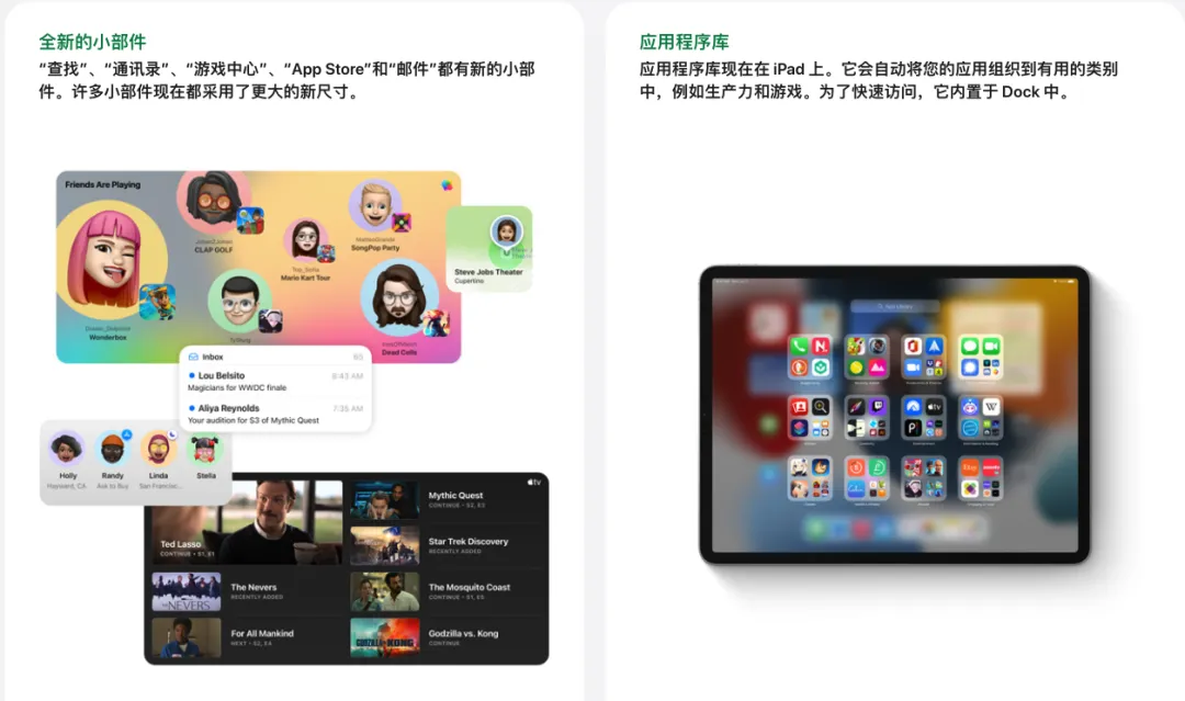 iPadOS15 可以更灵活地放置小组件,并且新增了适配更大屏幕的小组件。