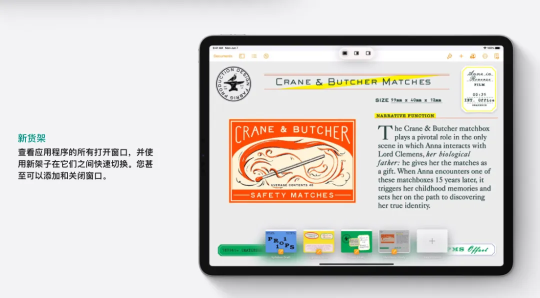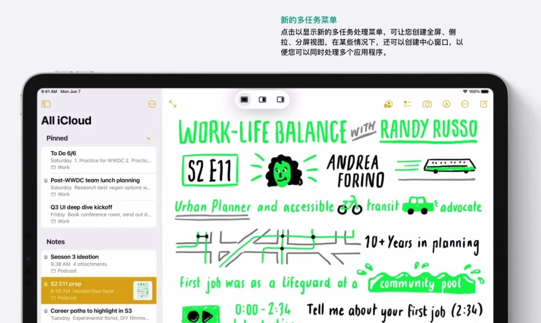 新的多任务处理界面,可以创建全屏、侧拉、分屏视图,还可以创建中心窗口,以便同时处理多个应用程序。