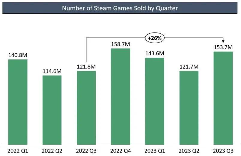 据外媒VGI统计,Q3期间Steam新游戏发布数量和收入再创新高,达到了惊人的1.54亿套和24.3亿美元,同比增长26%和51%。PC游戏与PC游戏平台往往是相互成就的关系,Steam数据创下新的纪录,也让外界见证PC游戏的巨大潜力。