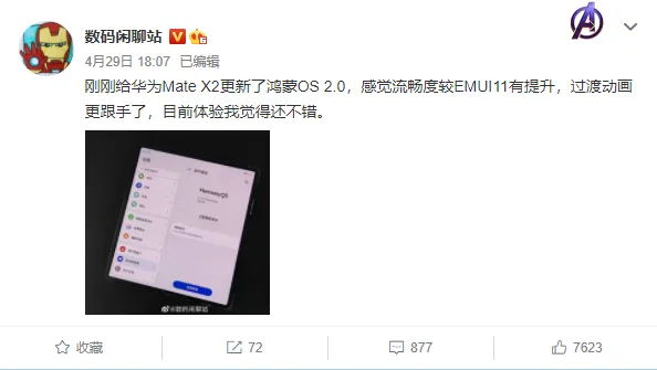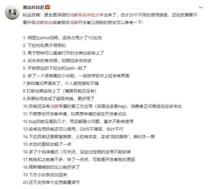 纷纷表示鸿蒙 OS 系统确实要比基于 Android 系统的 EMUI 更加优秀,同时运行内存占用也更少,运行机制方面也更加类似于 iOS 系统。