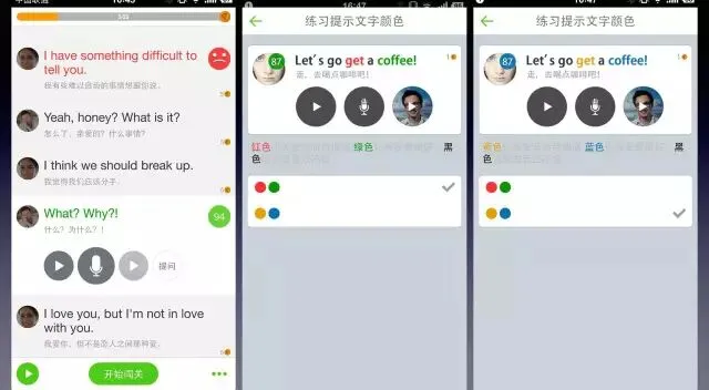 当你复读一句英语时,会根据你的读音标准与否做出评级,黑色表示还不错,绿色表示发音很赞,红色表示不够标准或不够清晰,而针对小部分红绿色识别困难的用户,在设置中提供了其他颜色方案。