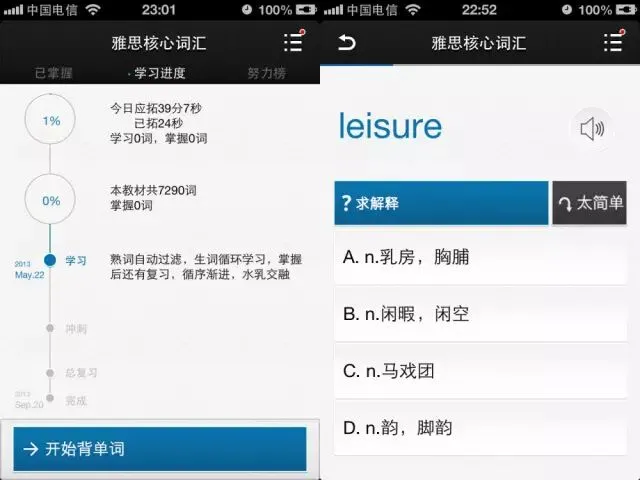 百词斩作为一款免费的单词记忆类软件,不仅在颜值还是内涵上都远超其它APP。