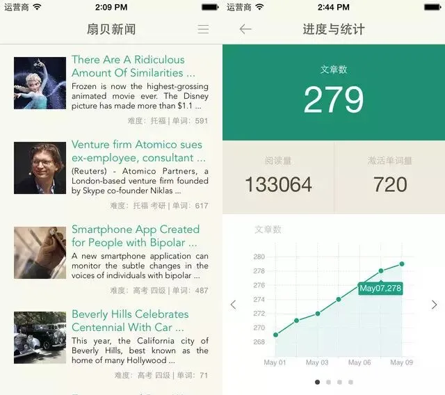 特别的,扇贝新闻可以记录你每天的学习进度,包括完成的文章数,被激活的单词数,将你日积月累的进步通过图表生动的展示。