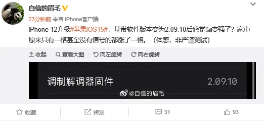 iOS 15 正式版的基带由原来的1.80.00 升级到了2.09.10。根据博主@自信的眉毛 反映,升级到 iOS 15 之后信号变强了。2.关机后位置可见