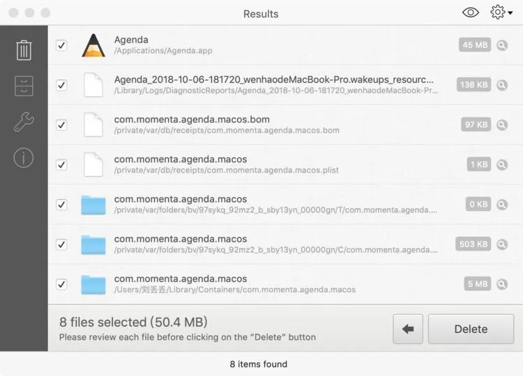 直接将软件拖到 TrashMe 中,相关的文件都会被检索出来,点击 Delete 就可以彻底将这个软件删除掉。配合清理垃圾的音效,整个过程十分爽快,简直是强迫症患者的福音。