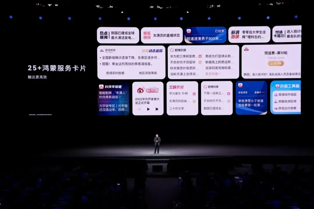 轻量化服务则是应用生态的重要组成部分,HarmonyOS独具特色的原子化功能改变了用户获取服务的方式,为用户带来系统级、卡片化、多入口、跨设备、主动服务的创新体验。而即用即走、易于分享、与App共享代码、无需重复开发等特性使得应用化繁为简,目前HarmonyOS生态提供了包括负一屏、桌面、小艺建议、小艺语音、智慧搜索等超过30个服务分发入口,并可适配手机、手表、座舱等设备,实现服务的跨端无缝流转,为合作伙伴带来更强的服务分发和触达能力。比如用户可在桌面或负一屏通过服务卡片实时查看微博热搜话题排名,这样的内容服务具备更精准、更主动捕捉用户兴趣的能力。现在已上架及正在开发中的鸿蒙原子化服务卡片超过25个,微博、新浪新闻等产品陆续发布鸿蒙版。