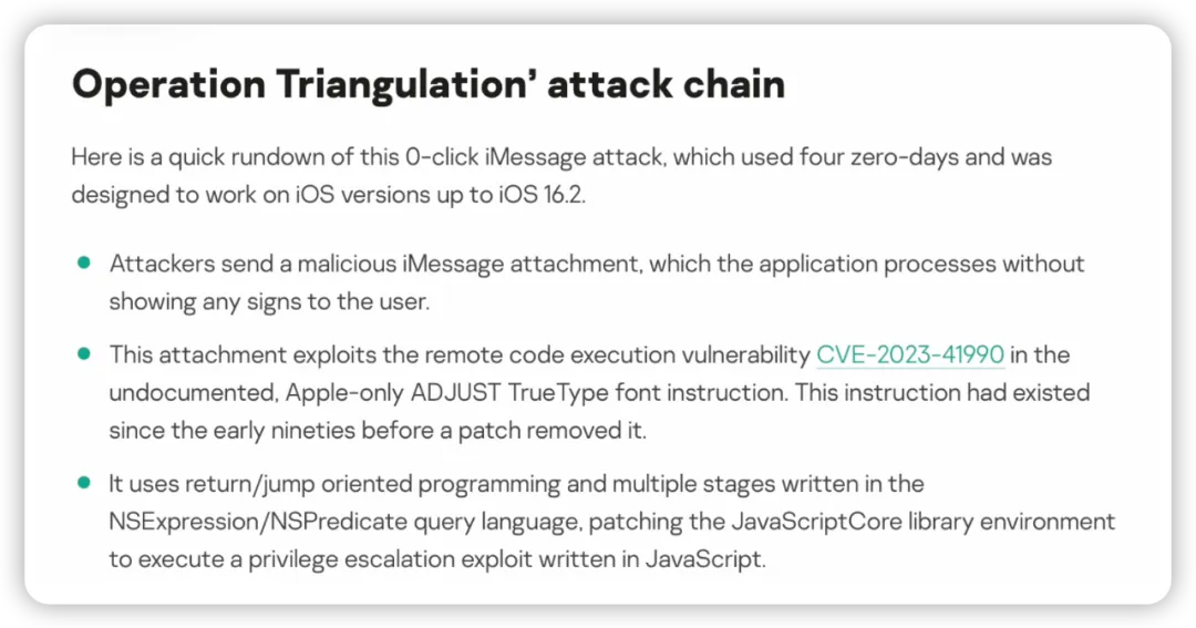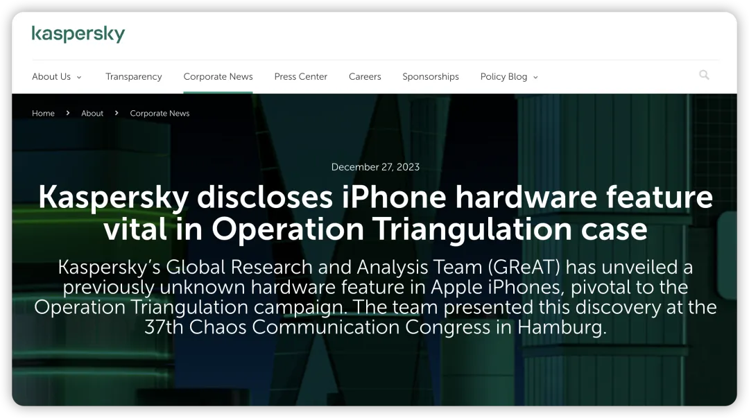 早在去年 6 月,卡巴斯基团队就曾发布了一份报告,指出了一个名为「Operation Triangulation」的复杂漏洞,可能会严重影响到 iPhone 的安全。
