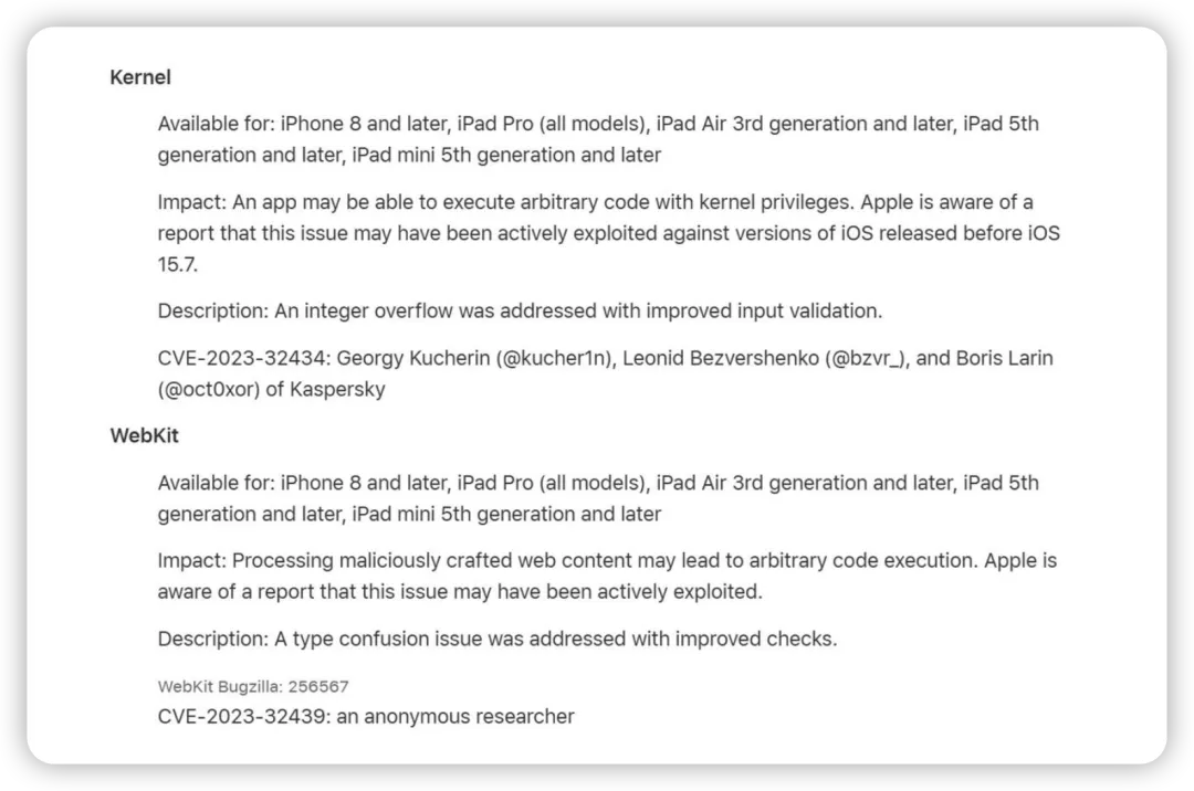 而苹果的动作也是相当之快,早在 iOS 16.5.1 / 15.7.7 版本更新中就修复了部分漏洞,并在后续的 iOS 17 系统中全面解决了这一问题。