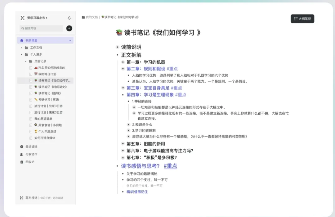 其革命性设计体现在对内容创作流程的重塑:著名IT博主张某将幕布用于读书笔记、会议记录甚至日记创作,认为「文字大纲比思维导图更适合深度思路整理」。在阅读《番茄工作法》时,他先用大纲梳理核心观点,再补充案例形成完整笔记,这种「先框架后细节」的方式显著提升了知识吸收效率。更难得的是,幕布虽功能强大却保持极简界面,迫使使用者专注内容而非排版技巧——正如一位用户所言:「最好的笔记工具,是让你忘记工具本身的存在」。