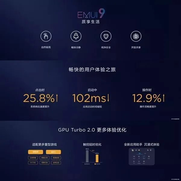 说到这里很多有小伙伴会有所疑问,华为基于Android 9.0深度定制的EMUI 9.0系统又有什么优势呢?根据行业媒体的测试数据来看,EMUI 9.0在应用启动、应用响应方面均有了明显提升,流畅度相比前代系统大涨了12.9%,此外EMUI 9.0中还支持GPU Turbo2.0功能,平均触控响应延迟时间降低36%,游戏性能进一步提升,同时AI功能也会更加丰富。