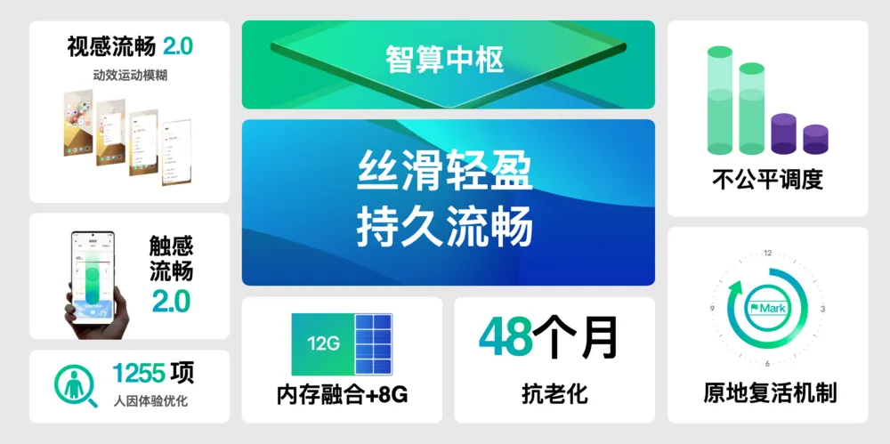 基于“不公平调度”等底层基础能力的突破,以及“原地复活”、“内存融合”的中间层资源调度的优化,还有上层操作感知的升级,vivo搭建出“智算中枢”,解决了安卓系统的原生性问题。