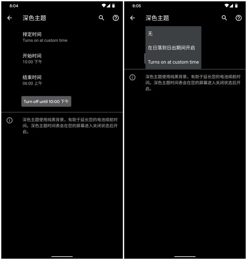 这项功能非常简单 —— 为深色主题新增定时功能,很多本土定制 UI 早已提供。