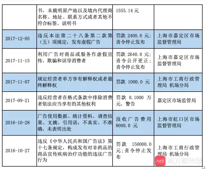 其中,单次罚款超过10万元有两例,一例是因为违法“使用或者变相使用国家机关、国家机关工作人员的名义或者形象”而被处罚20万元,另一例是因为“违反《中华人民共和国广告法》第十七条规定,构成发布对非药品的商品宣传疾病治疗功能的违法广告行为”而被上海市工商行政管理局机场分局处罚15万元。