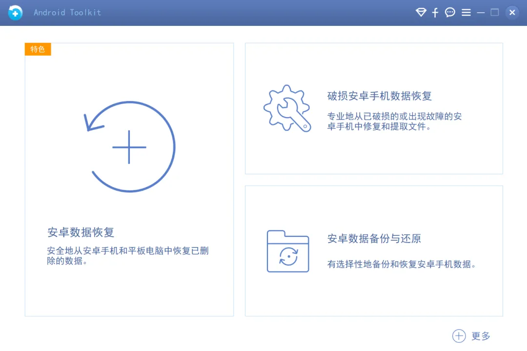 软件包含三大功能:安卓数据恢复、破损安卓手机数据恢复、安卓数据备份与还原,这里主要用到的是安卓数据恢复。
