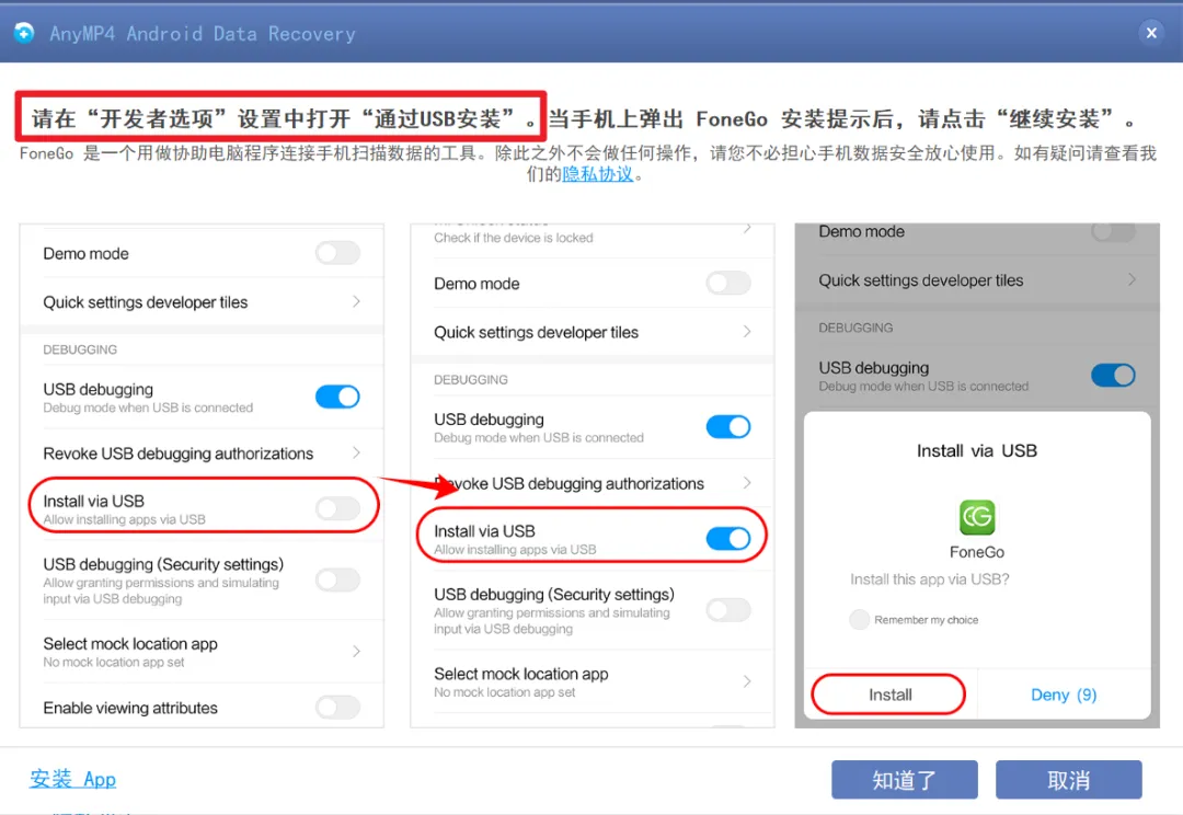 按提示开启手机的开发者选项并打开“通过 USB 安装”,随后安装 FonGo 并授权即可开始扫描。