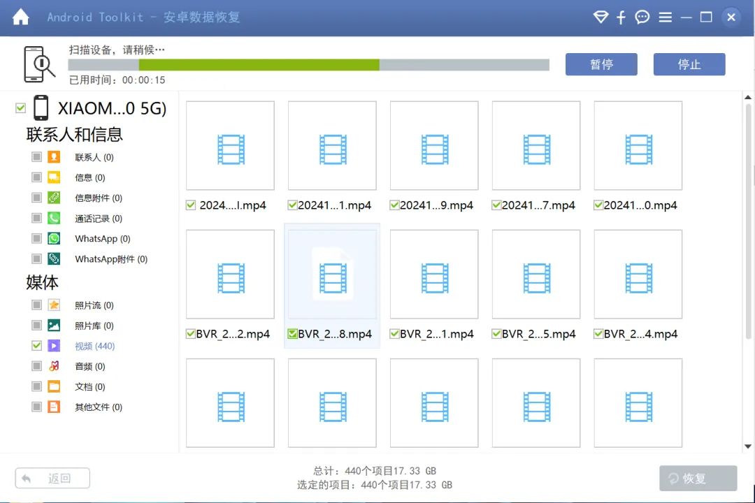 我测试时手机里只剩四十多个视频,扫描后却恢复出了四百多个。