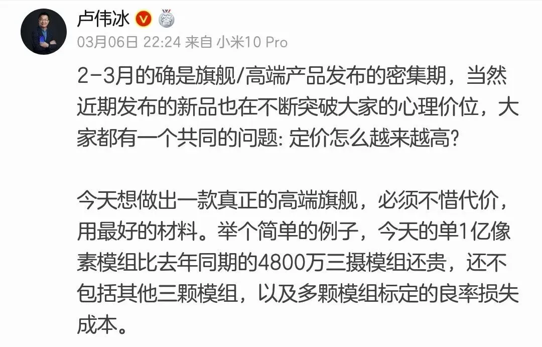 “今天的单1亿像素模组比去年同期的4800万三摄模组还贵,还不包括其他三颗模组,以及多颗模组标定的良率损失成本。”