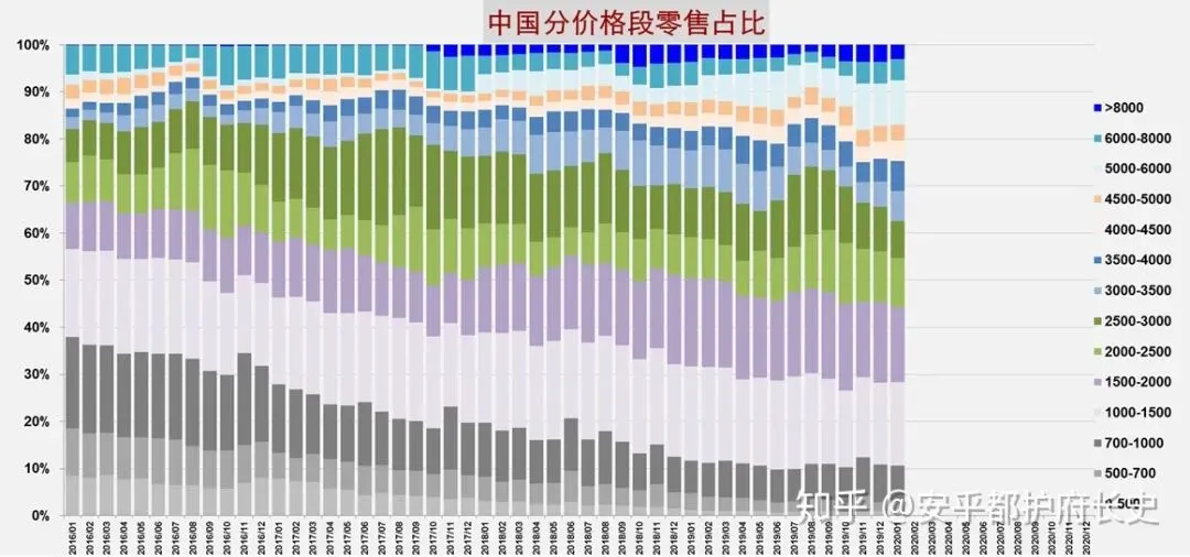 在知乎@安乎都护府长史 发布的,中国分价格阶段零售占比中,可以看到3500元以上价位的手机占比,呈节节攀升的趋势。