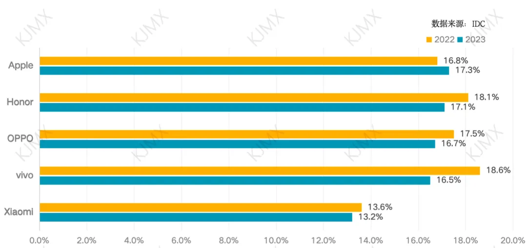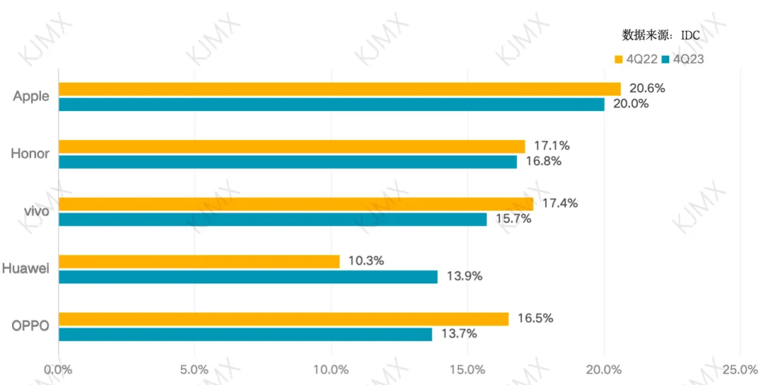 不要忘记看呦!随着时间来到2024年1月下旬,关于过去的2023年第四季度智能手机市场表现情况,也终于出现了确切的调查报告信息。市场调研机构 IDC 近日的报告中就公布了相关内容,且这份报告显示国内市场销量最高品牌在2023年出现了新的变化。IDC的报告显示,2023年国内智能手机出货量总计2.713亿部,与2022年相比下降了5.0%。达到10年来的最低水平。不过,虽然全年的智能手机市场表现出现了下降,但按照不同季度的销售情况来看,国内智能手机市场正在走向复苏。在刚刚过去的2023年第四季度,国内智能手机市场出货量为7360万部,同比增长1.2%,标志着连续十个季度同比下降结束。分析报告中显示,高端消费者是主要驱动力,刺激了对旗舰产品的需求。与此同时,中低端设备的需求仍然疲软,阻碍了市场的整体增长。2023年第四季度,苹果市场份额占比20%,成为了销售榜单的首位。与2022年第四季度相比,同比下降2.1%。荣耀位列第二,市场份额占比为16.8%,与2022年同期相比出货减少了0.9%。vivo排名第三,市场份额占比15.7%,与2022年同期相比出货减少8.4%。华为市场份额占比13.9%,并据此成为了2023年第四季度国内市场出货的第四位。与2022年同期相比,同比增加达到了36.2%。OPPO排名第五,市场份额占比为13.7%,同比降低16.1%。苹果份额占比17.3%,市场份额占比同比有所提升,但出货同比降低了2.2%。