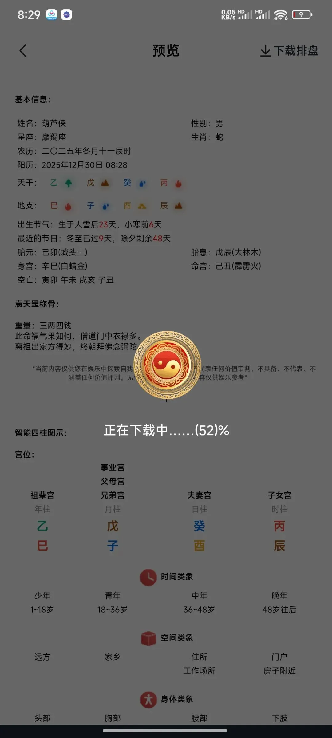 ✅ 精准智能排盘:输入公历/农历出生时间+地点,自动校正真太阳时,生成四柱八字、天干地支、五行分布、十神、神煞、纳音等完整命盘。✅ 多维命理分析:五行旺衰与平衡、命局格局、用神喜忌、大运流年走势、神煞查询,支持太极点转换拓展解读维度。✅ 运势与择吉:每日运势、流年大运、黄历查询、五运六气分析,适配婚嫁/搬家/开业择吉场景。✅ 学习:内置易学古籍库(如《渊海子平》《滴天髓》)✅ 分享与管理:一键生成排盘截图分享;历史排盘存档,方便复盘对比。温馨提示:本人提供用户下载的所有内容均来自网络,版权归作者本人所有,仅限技术交流,不得用做商业用途。如有侵权请与我们联系,谢谢您的理解。您必须在下载后的24个小时之内,从您的电脑或手机中彻底删除上述内容。